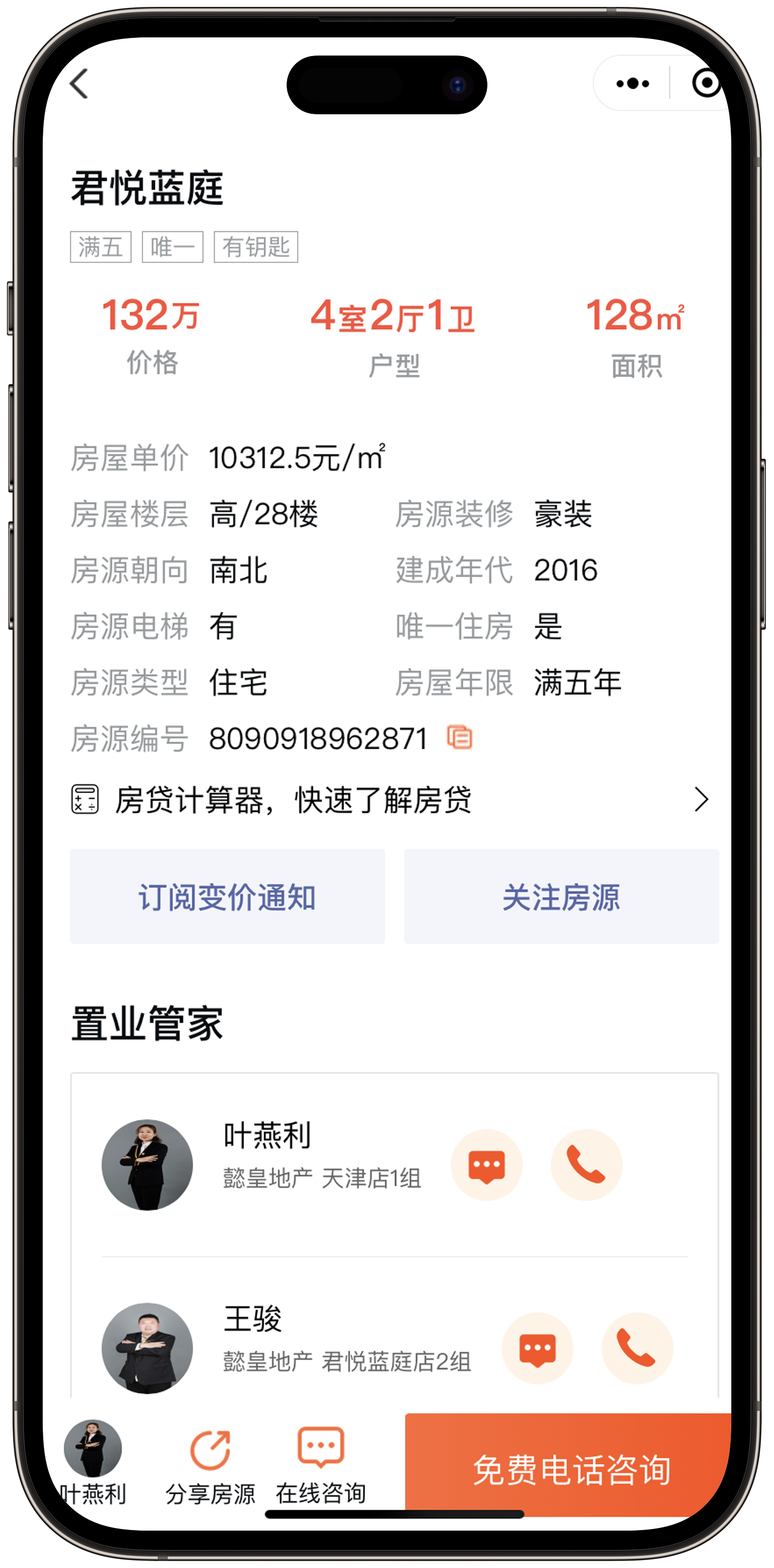 一對(duì)一咨詢服務(wù)隨時(shí)在線上等候您的問詢。點(diǎn)擊進(jìn)入您心儀的房源,選擇您喜歡的房產(chǎn)經(jīng)紀(jì)人,點(diǎn)擊“電話”,隨時(shí)隨地,隔著屏幕也可以獲取清晰而全面的專業(yè)解答,一解您所有疑惑。