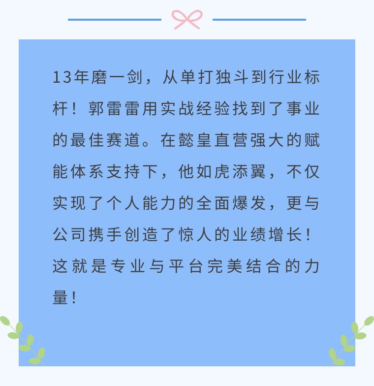 在此,我們也想對在外奮斗的家人們說,如果你們也面臨與郭雷雷相似的困擾,那么擁有 20 年深厚底蘊、成熟企業(yè)文化與強大支撐賦能體系的懿皇地產(chǎn),定能為你排憂解難,成為你事業(yè)騰飛的堅實后盾!